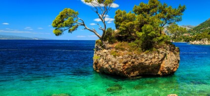 Punta Rata, en Brela, es una de las playas croatas más bonitas y una de las más fotografiadas. La imagen del acantilado emergiendo del agua, con árboles creciendo en sus rocas bañadas por el mar, es bastante famosa.