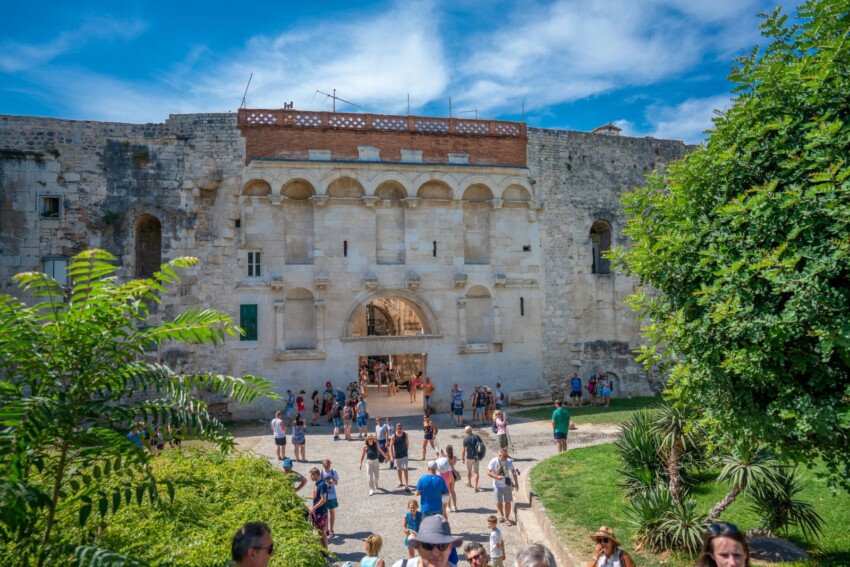 El palacio es accesible a través de cuatro puertas monumentales, cada una orientada hacia un punto cardinal y bautizada con el nombre de un metal precioso. La Puerta Dorada (norte) es la entrada más imponente, decorada originalmente con nichos que contenían estatuas de los cuatro tetrarcas. Hoy, fuera de la puerta se alza la estatua monumental del obispo Gregorio de Nin, obra del escultor Ivan Meštrović. Tocar el pulido dedo gordo del pie de la estatua se ha convertido en una tradición para los visitantes, pues se cree que es un amuleto de buena suerte.