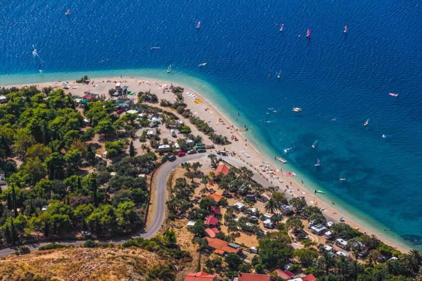 Des forêts de pins denses entourent la baie, mais il n’y a pas d’ombre naturelle sur la plage, donc si vous prévoyez de passer toute la journée ici, prenez un parasol avec vous ou louez-en un.
