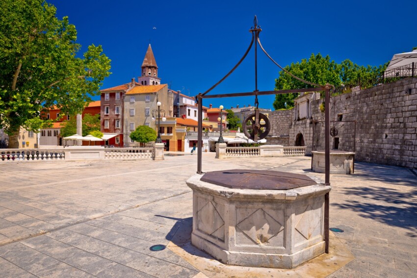 Dans l’atmosphère de la Place des Cinq Puits, on peut encore voir les puits qui ont été construits à l’époque des invasions turques pour fournir à la ville les ressources en eau nécessaires. Dans la première moitié du XIXe siècle, le premier jardin public de Dalmatie a été construit sur cette place et c’est toujours l’un des plus beaux endroits de la ville.
